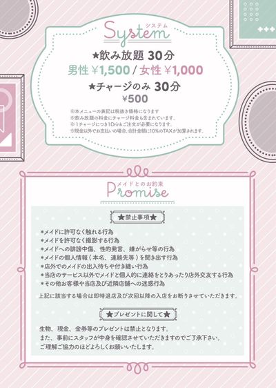 500円(1チャージにつき1drinkのご注文が必要になります。)