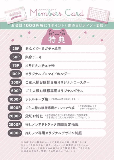 お会計1000円毎に1ポイント(雨の日はポイント2倍)